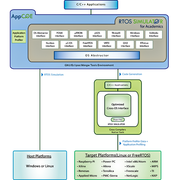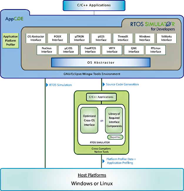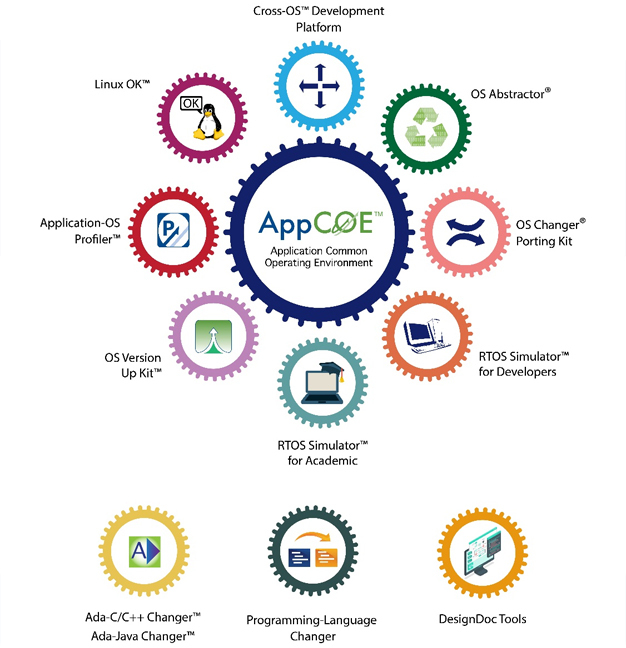 AppCOE, Cross-OS Development Platform, RTOS Simulator, Linux OK, OS Version UpKit, Programming Language Changer, DesignDoc Tools, Application-OS Profiler,